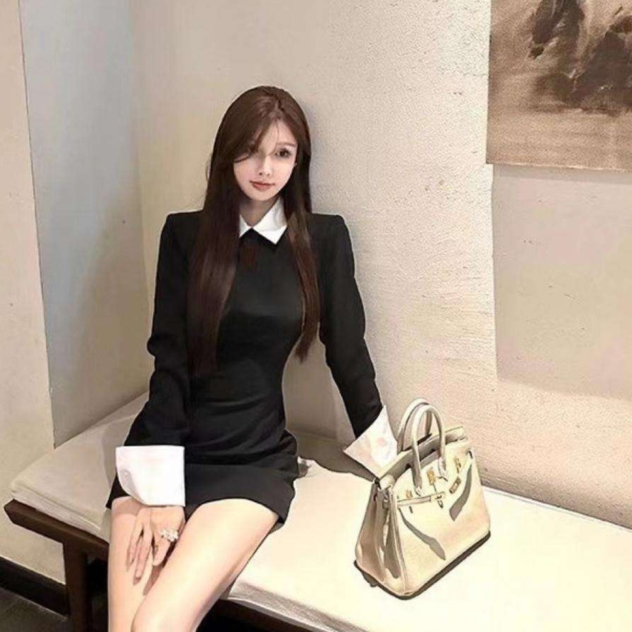 白い襟と袖口のコントラストがアクセントで胸元のブローチ風装飾と肩掛けチェーンバッグが上品さを演出♪