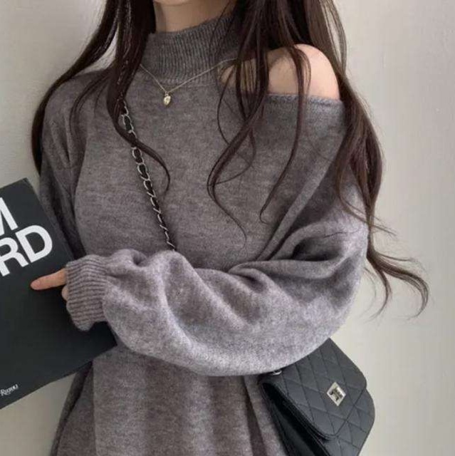 セクシーなカットが魅力のニットミニワンピース。首元から肩にかけてのデザインが女性らしさを引き立て、ゆったりとしたシルエットで体型カバーも叶えます。シンプルながらも洗練された印象を与え、デイリースタイルや特別な日にも合わせやすい一着。多彩なコーディネートであなたの魅力を引き出します。
