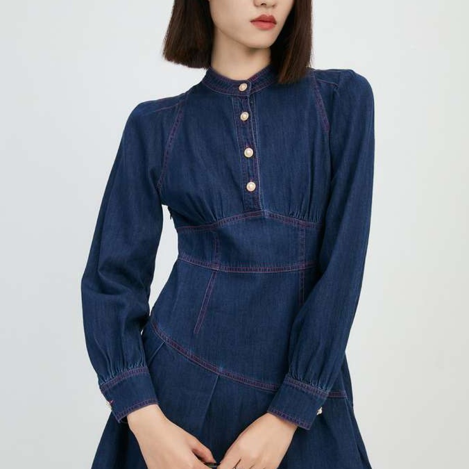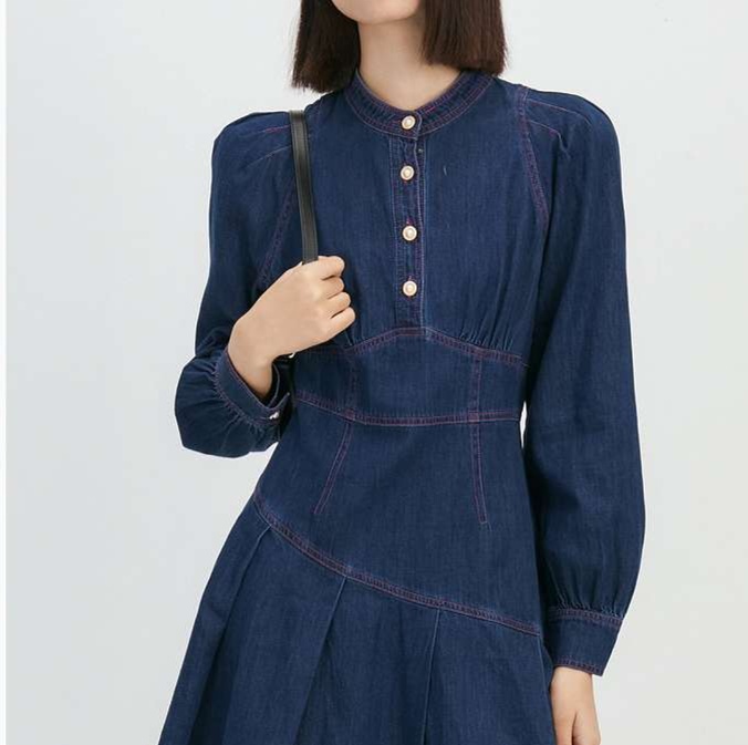 クラシカルなデニムドレスのシルエットに現代的なエッセンスを加えた上品な仕上がり