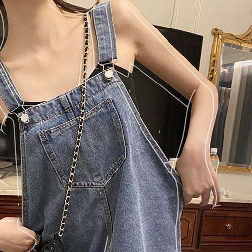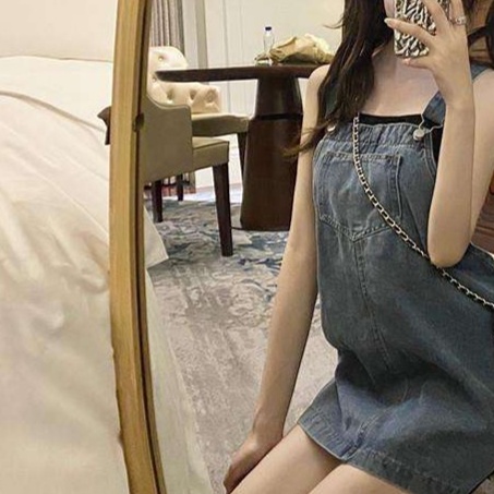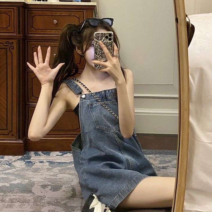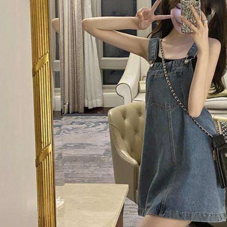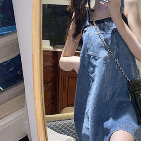 肩ひも付きの可愛らしいデニムミニワンピース。