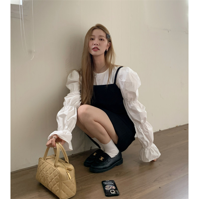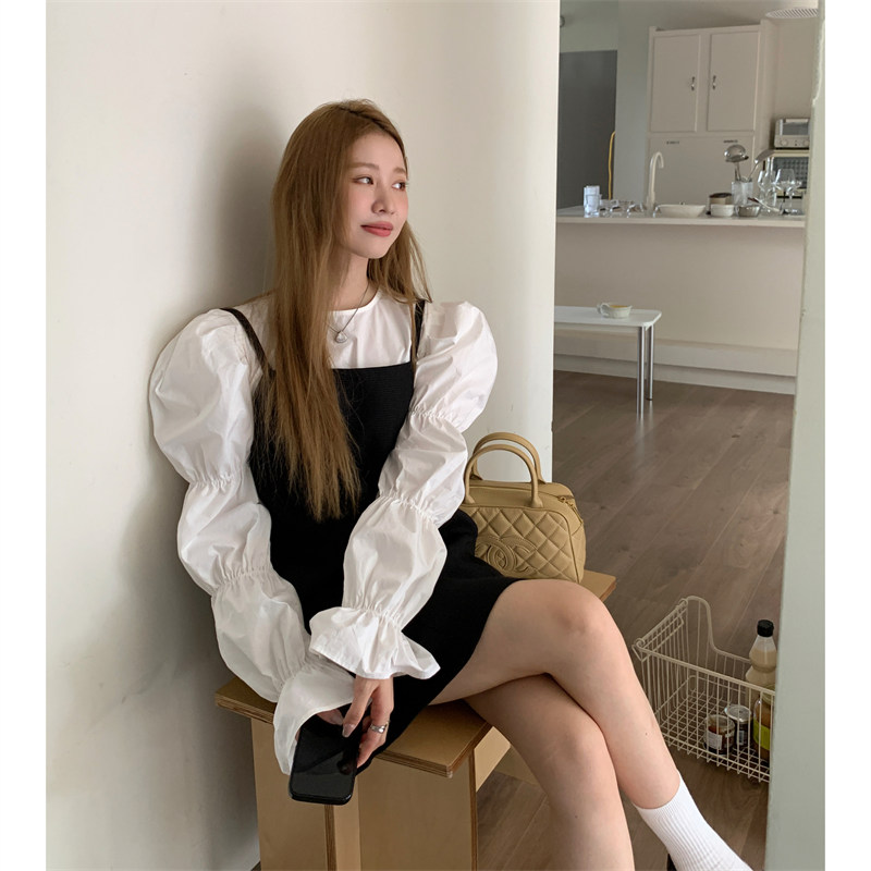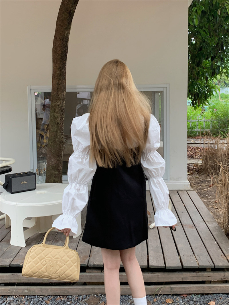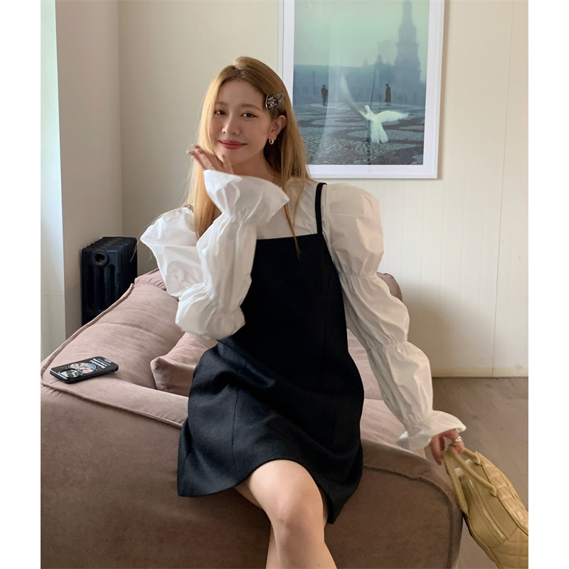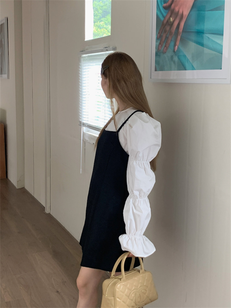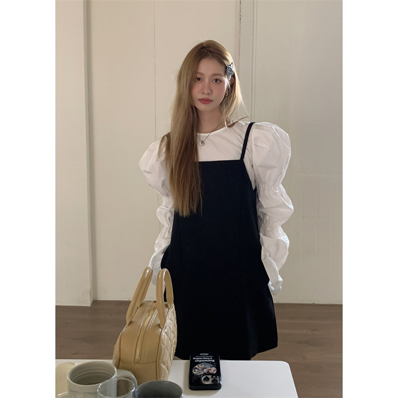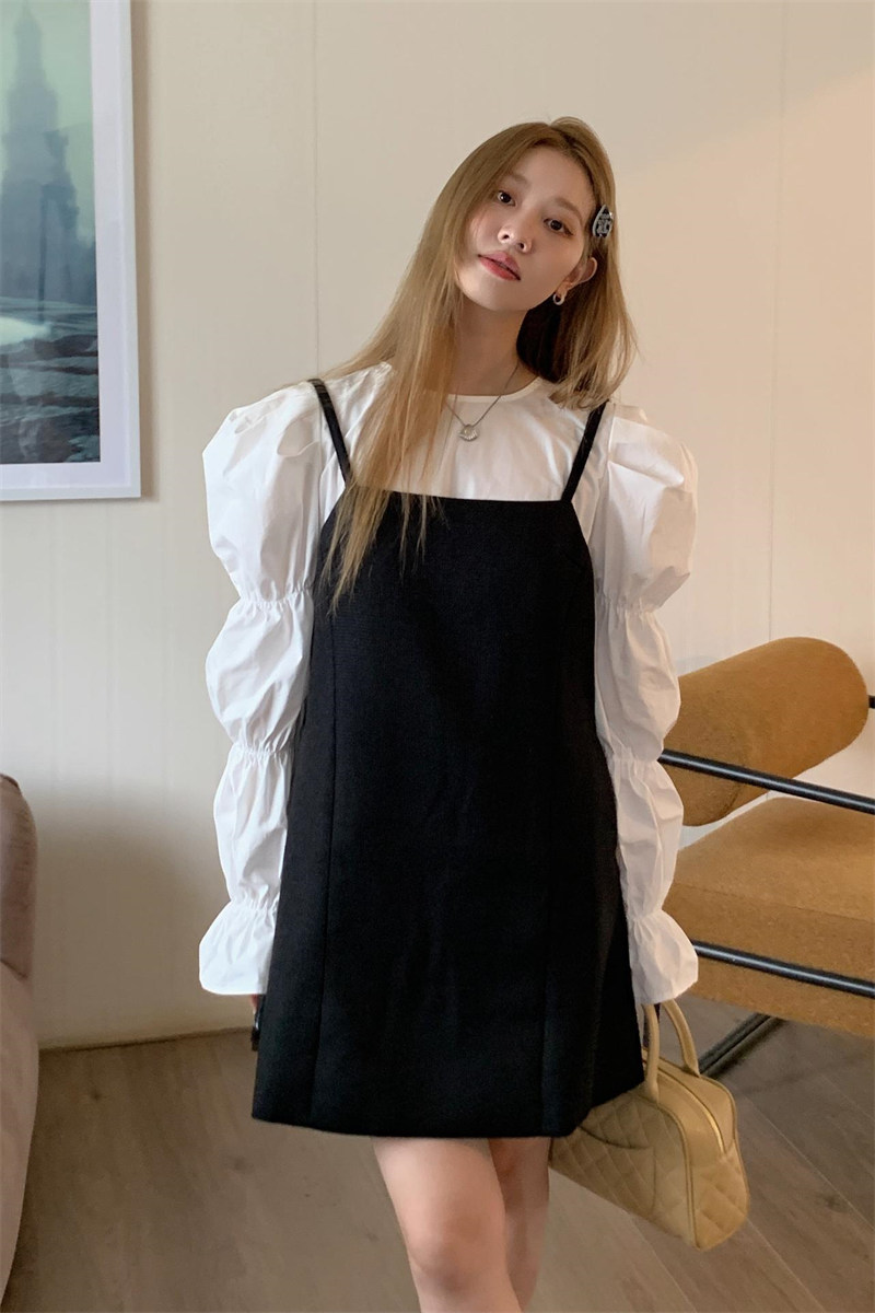 今季注目の黒キャミソール風ミニワンピースと白ブラウスのセットアイテム。