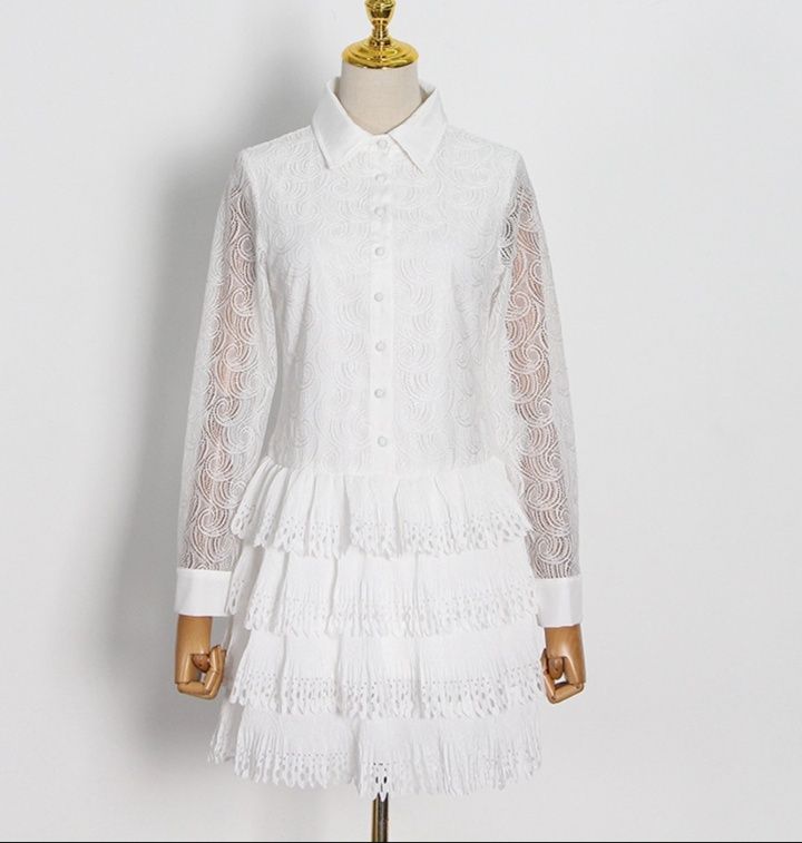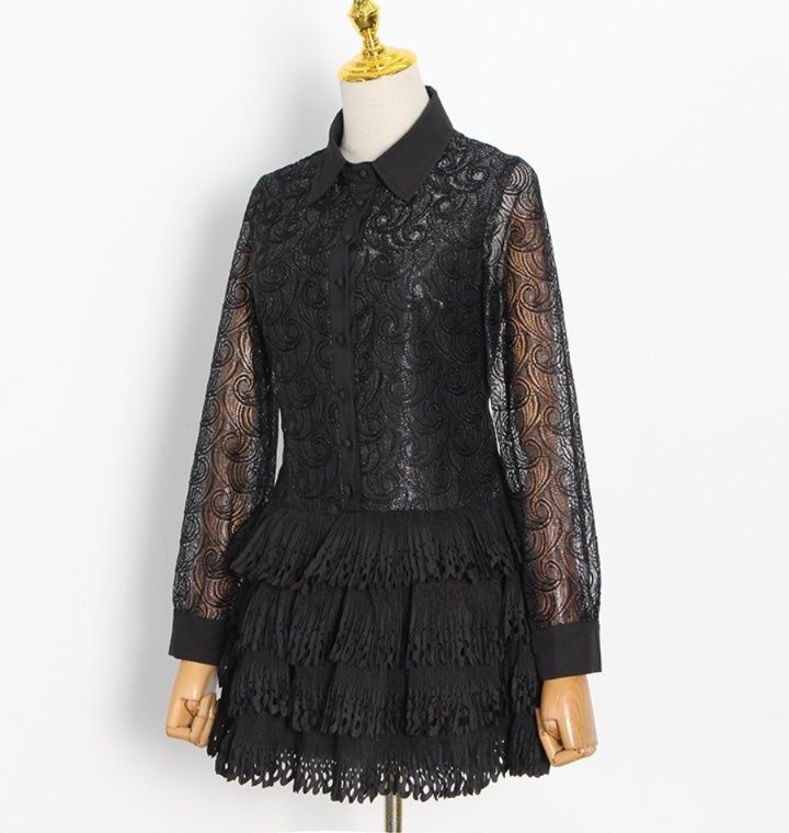 スカート部分は何段にも重なったティアードフリルデザインで軽やかな動きを表現し、女性らしいシルエットを作り出します。